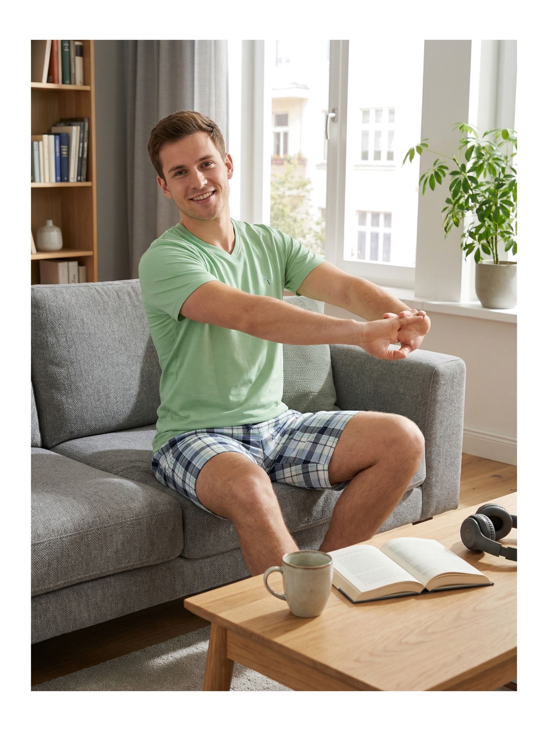 Der Phil & Co. Berlin Herren Pyjama verbindet modisches Design mit hohem Komfort. Das Shorty Set mit klassischem V-Ausschnitt überzeugt durch moderne Prints und stilvolle Farbverläufe – perfekt abgestimmt auf die Frühjahr/Sommer-Saison.