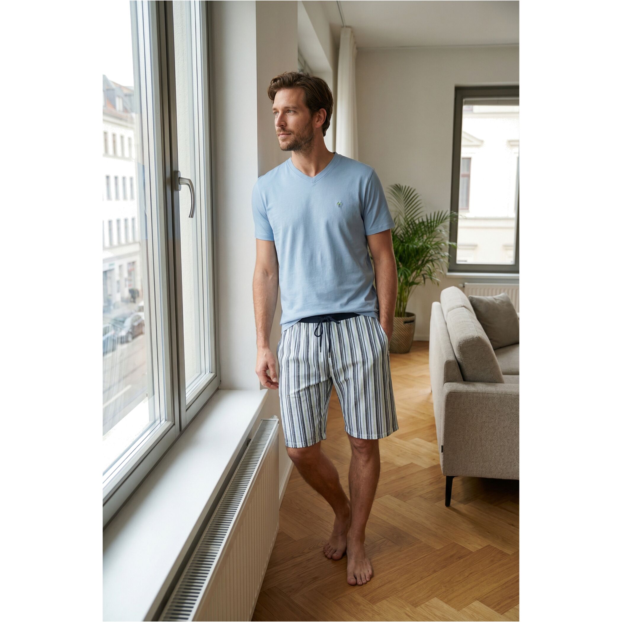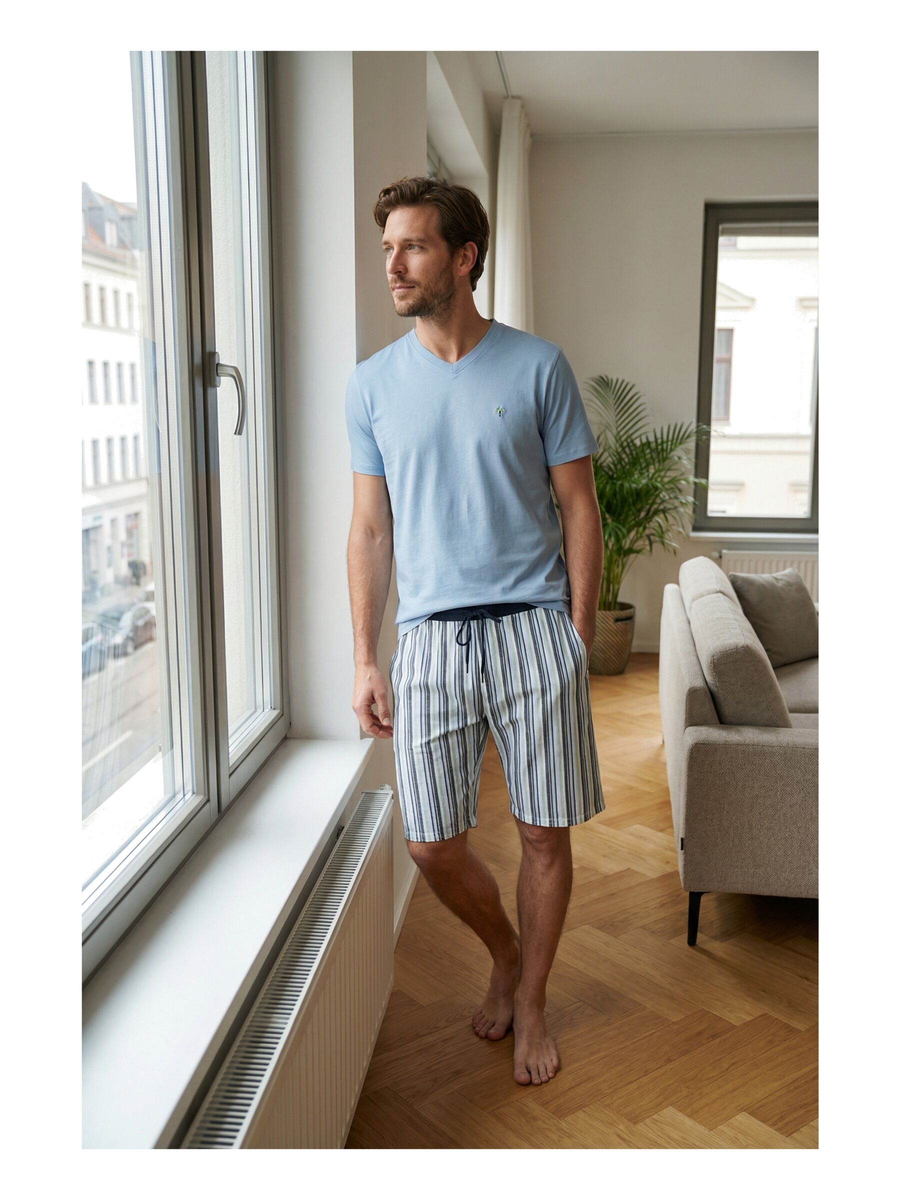 Der Phil & Co. Berlin Herren Pyjama verbindet modisches Design mit hohem Komfort. Das Shorty Set mit klassischem V-Ausschnitt überzeugt durch moderne Prints und stilvolle Farbverläufe – perfekt abgestimmt auf die Frühjahr/Sommer-Saison.